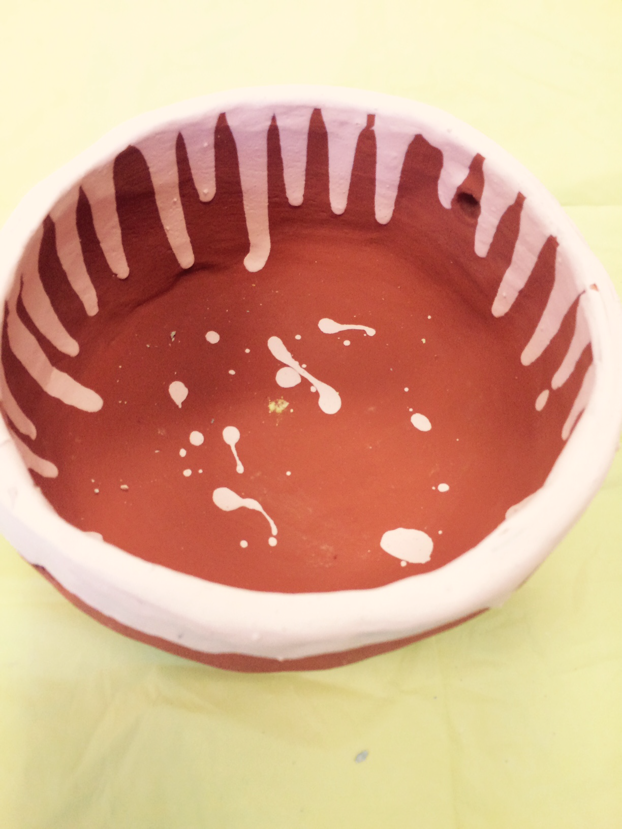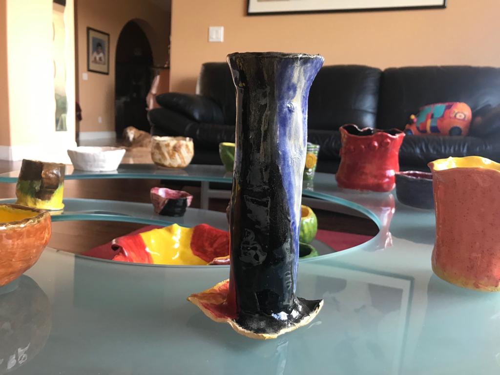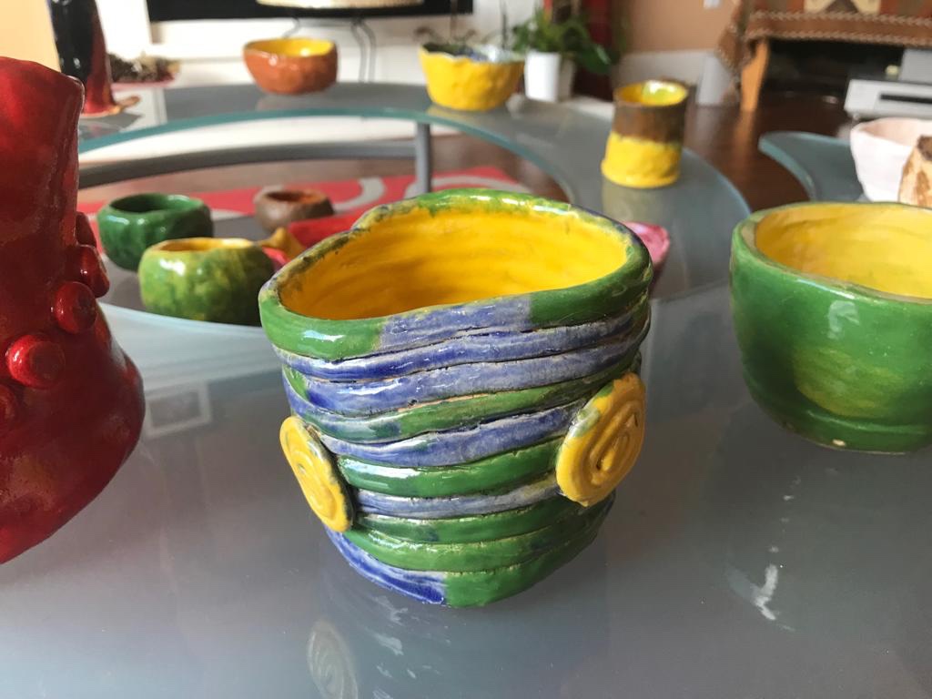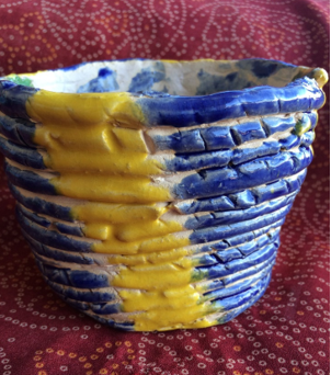 It was wonderful to learn that I could wind coils of clay to bring a piece of pottery to life – a simple container for small household items. I was the creator and ideas were flowing! I made a flat round bottom then made coils and placed them around the base. As I added more coils, I started to increase the radius of the container such that it became progressively wider. I carved the surface of the coils with a sharp tool to create simple vertical lines. I fancied bisque as the color for my container. Instead of applying the bisque glaze uniformly over the container, I applied wide and slanted lines of yellow and blue in such a manner that intervening portions of bisque were not touched by the brush. Channeling my creative abilities through clay was blissfully divine!