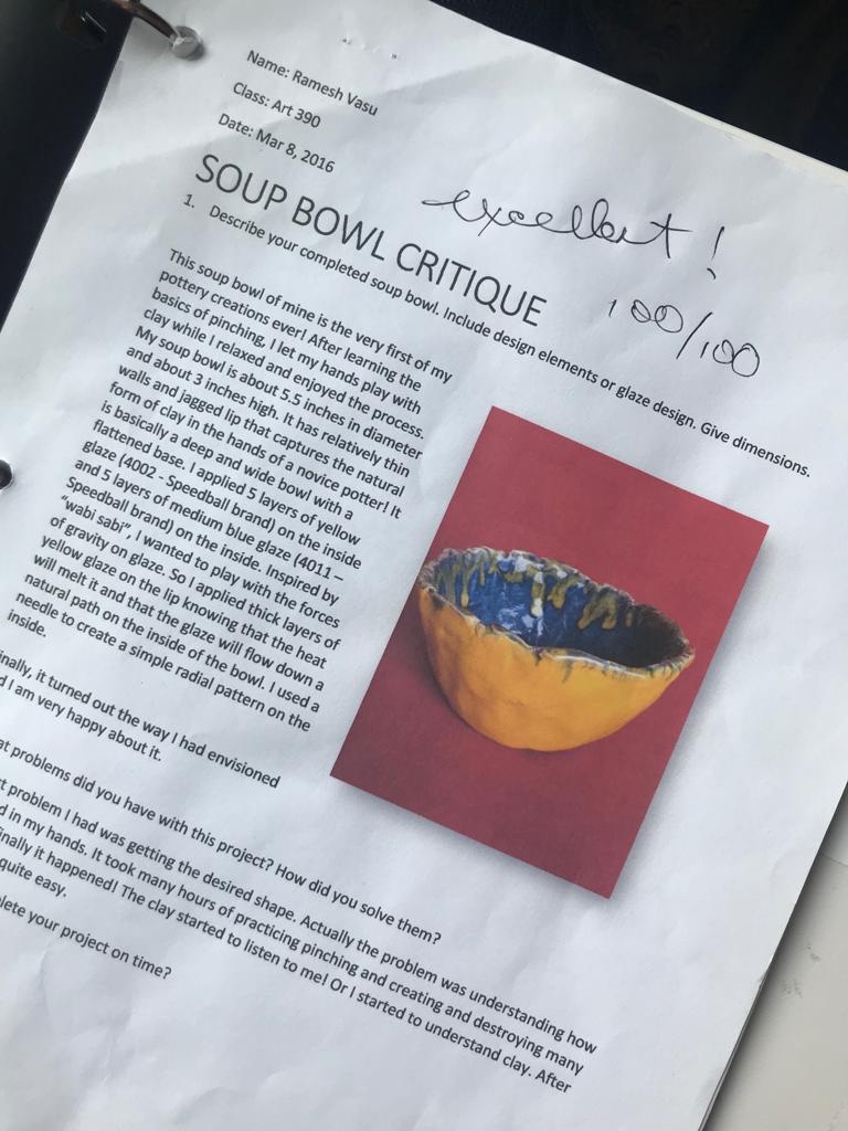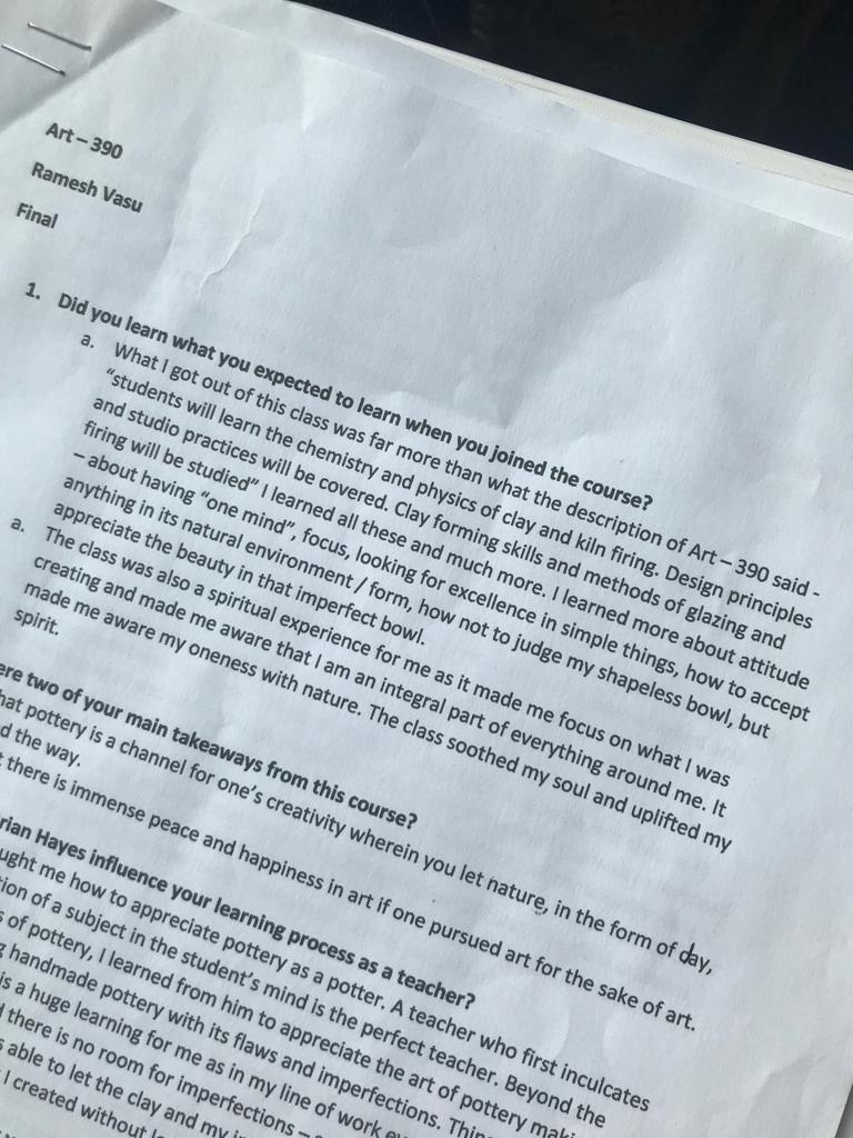 Jazz music playing in the background welcomed us as we entered the classroom for the first time. This relaxed ambience mirrored the calm and artistic disposition of the instructor, an elderly man who paired his vocation with his passion for pottery. This aligned very well with my motivation to relax in class.